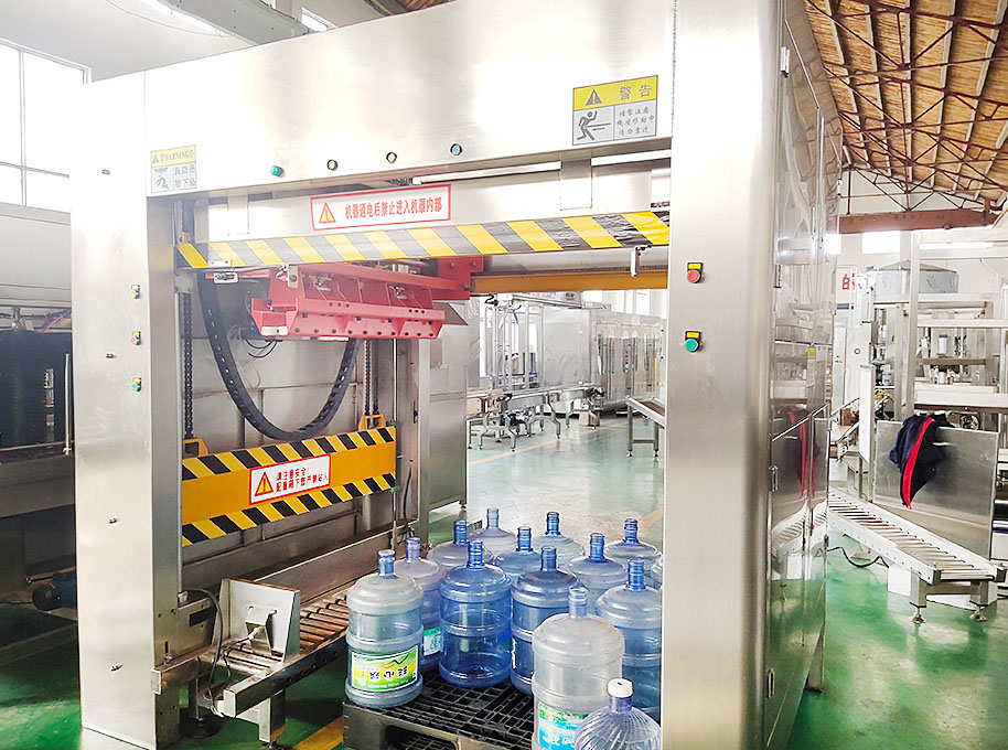 大桶水码垛机是将已罐装好的5加仑桶按一定排列码放在托盘(木质、塑胶)上,进行自动堆码,可堆码多层,然后自动输至实托工位,便于叉车运至仓库储存。