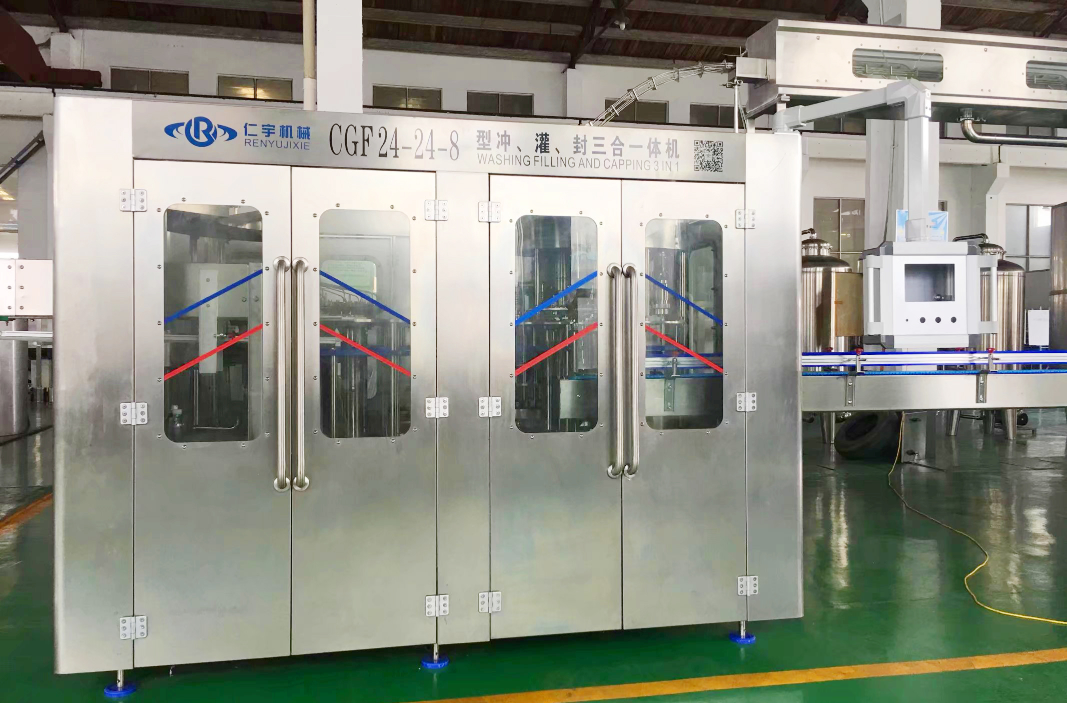 三合一饮用水灌装设备采用卡瓶颈传动技术,实现全自动冲瓶、灌装、旋盖等工序,自动化程度高。饮用水灌装生产线的大部分电气系统零件均采用国外先进产品,与液体接触的零件全部使用优质不锈钢材料,具有耐磨、稳定、故障率低等特点,产品质量处于国际先进水平。仁宇灌装机械的饮用水灌装设备适合200-1500ml的PET瓶装水的灌装生产,根据物料水位高度主动控制,过程全自动生产完成。三合一饮用水灌装机选用悬挂式灌装,不一样的瓶型、瓶子大小、厚簿都可以操作,使用范围广泛。