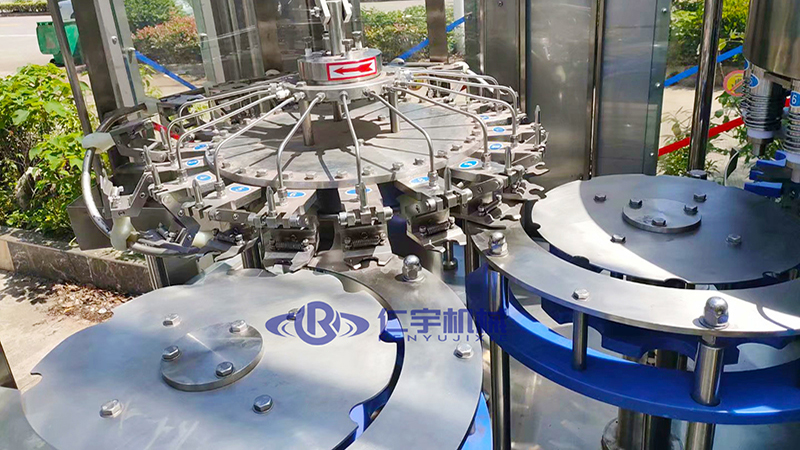 仁宇机械生产的XGF型三合一灌装机用于聚脂瓶装矿泉水、纯净水等不含气饮料的生产,在一机上实现冲瓶、灌装、封盖。产量2000-36000瓶/小时,可供用户选择。 引进日本、意大利最新技术,灌装机采用压力式定液面灌装原理,灌装速度快,液面控制稳,无滴漏现象。弹簧式冲洗钳手,空瓶随轨道自动进行180°翻转,内外二道冲洗,冲瓶效率高。采用磁力扭矩式拧盖头,实现抓盖、拧盖功能。拧盖力矩无级可调,具有恒力矩旋封塑盖功能,且不伤盖,封口严密可靠。整个灌装机采用PLC电脑程序控制及人机界面触摸屏按钮,具有料缸内液面自动控制,无瓶不灌装,无瓶不加盖等功能,采用变频器无级调速,生产能力数字显示,调整极其方便。