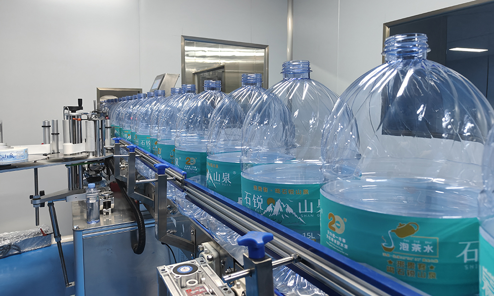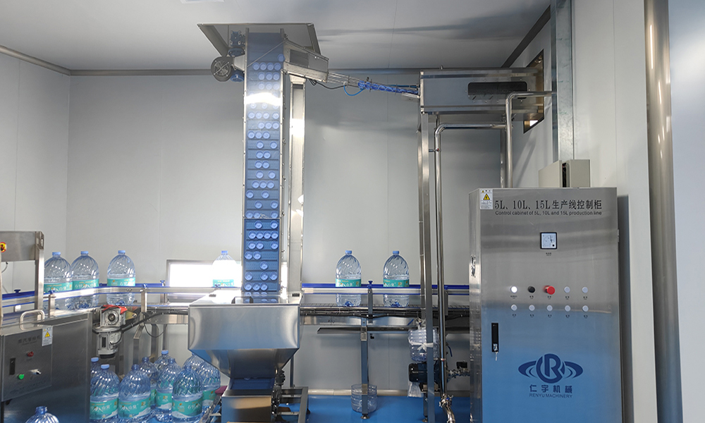 水处理系统→吹瓶机→进瓶输送→三合一灌装机(冲瓶、灌装、封口、自动上盖理盖、在线式盖消毒)→输送→灯检箱→吹干机→自动套缩标机(贴标机)→膜包机(装箱机)→码垛机→成品。
