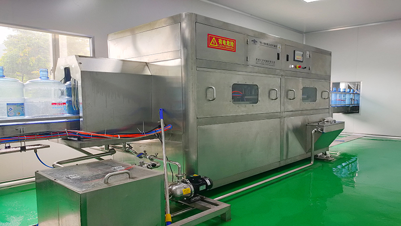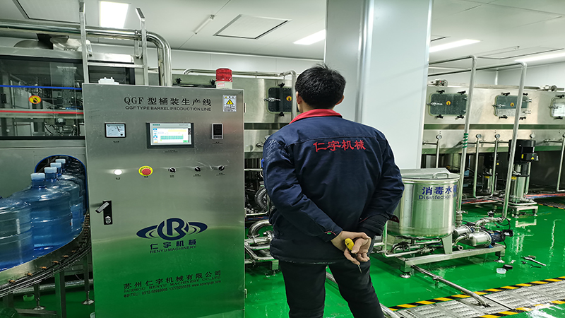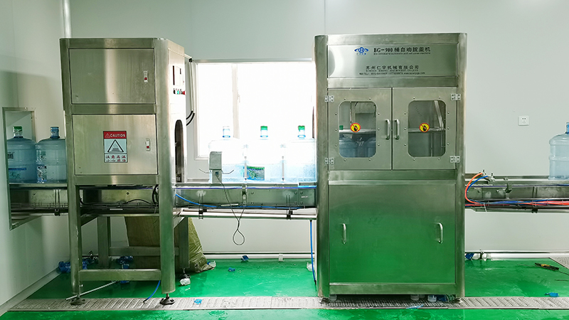 桶装水灌装机:集消毒、冲洗、灌装、封盖于一体,常规型12-18道优先清洗,每道冲洗时间为15秒。冲洗时间可以自动调节。在此过程中,桶的外部也利用喷嘴进行喷洗,将喷嘴往上升,深入空桶内部,对桶内部进行消毒、喷洗。通过自动下桶装置将清洗后的空桶送入灌装位置,并进行灌装,过程中溢出的水将回流到纯水箱,避免成品水的浪费。灌装后的大桶由输送链带其依次进行挂盖和封盖。