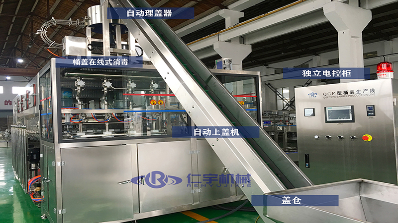 桶装水生产线设备组成:进桶输送-割标拔盖机-自动内外刷桶机(外刷内高压冲洗机)-自动上桶装置-三合一桶装水灌装机(冲洗,灌装,封口,独立电控柜)-自动上盖机-在线式桶盖消毒机-灯检设备-自动套标机-蒸汽收缩炉-打码机-自动套袋机-码垛机-成品